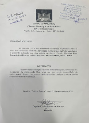 Em sessão realizada na Câmara Municipal de Santa Rita, o vereador Deyvison Juan, apresentou indicação ao Poder Executivo, solicitando a implantação de camada asfáltica em toda extensão da Rua Atanásio de Moraes, além de parte da Rua São Pedro e Saturnino de Moraes, ambas no centro da cidade.